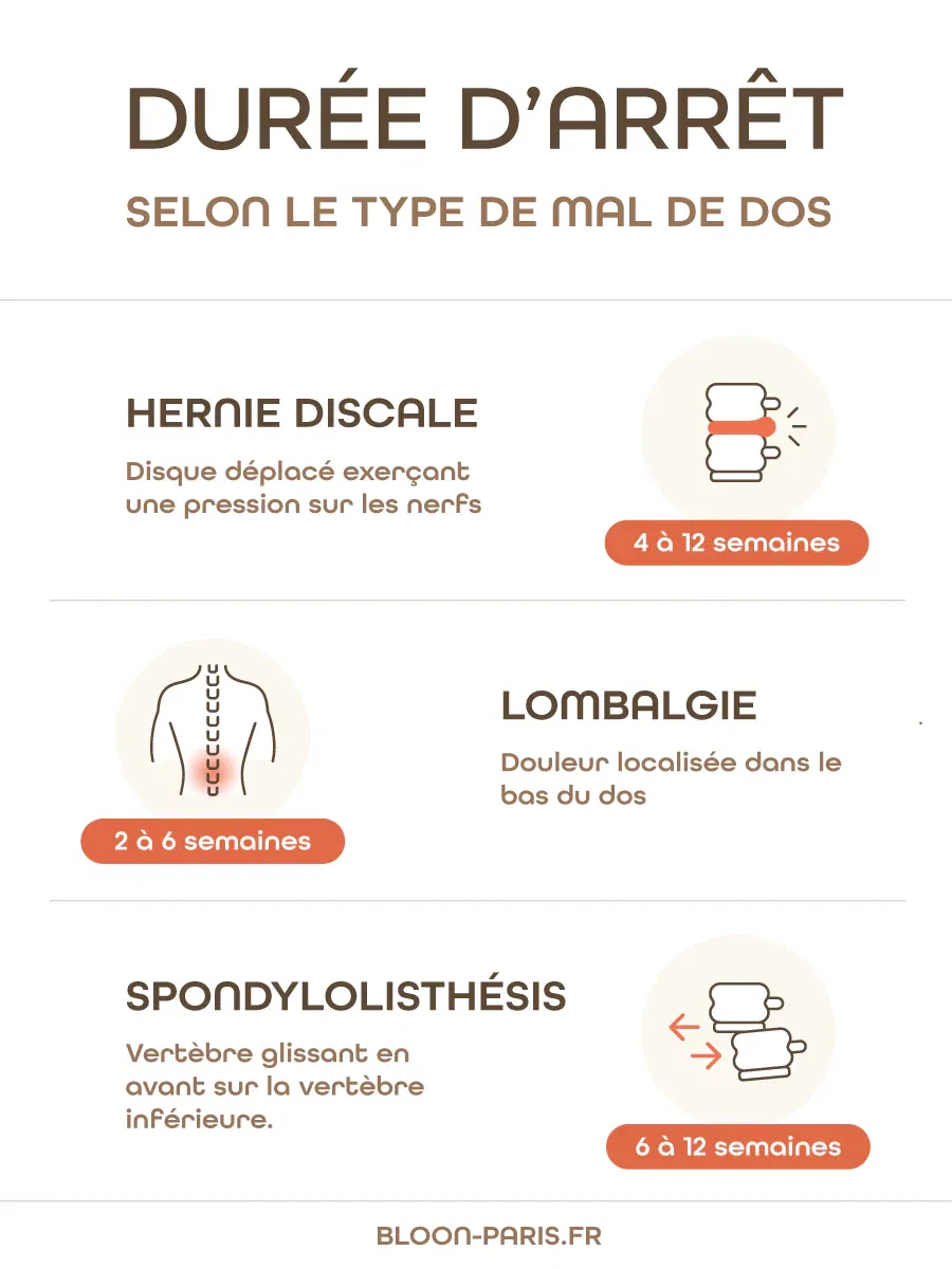 La durée de votre arrêt de travail dépend du cas de mal de dos dont vous souffrez. Si vous avez une hernie discale, votre arrêt maladie peut durer de quelques semaines à plusieurs mois, selon le besoin de repos et de traitement. En général, pour hernie discale un arrêt maladie dure environ 4 à 12 semaines.